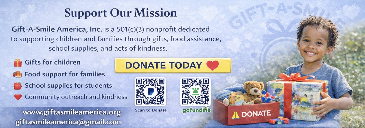 Gift-A-Smile America is a nonprofit organization dedicated to serving children and families in need through faith-centered compassion, dignity, and love. Our mission is to bring hope, joy, and essential support to vulnerable communities—especially children—through meaningful outreach programs.
